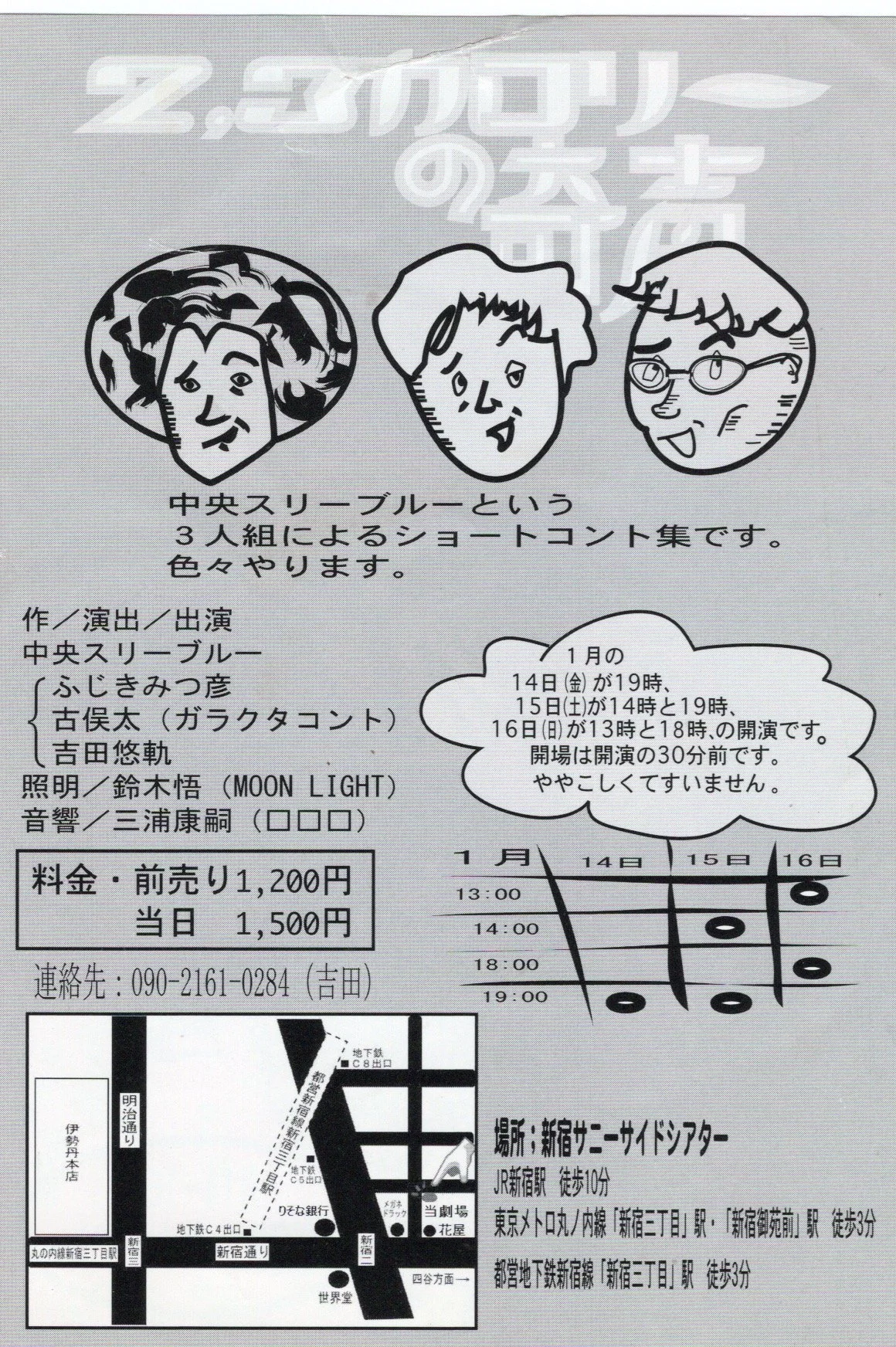 作・演出・出演: 中央スリーブルー (古俣太 (ガラクタコント), 吉田悠軌, ふじきみつ彦)